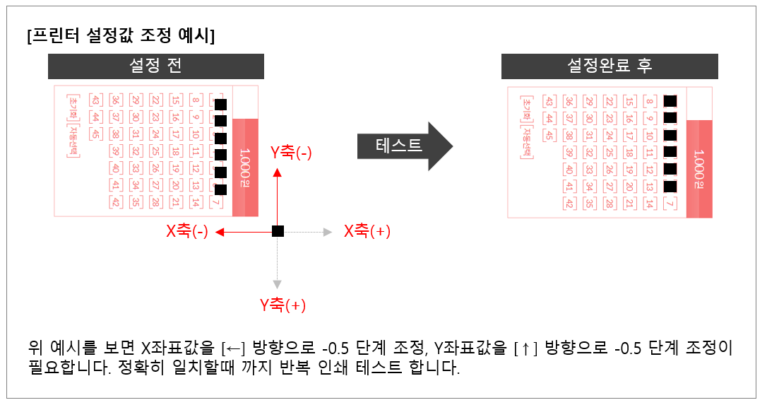 ⑦ 출력이 아래와 같이 정확치 않다면 [설정] 메뉴로 들어가 0.5 단위로 조정해주세요