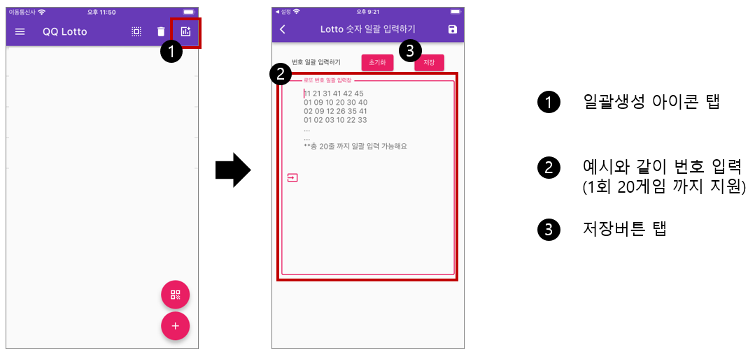 ⑤ 번호 일괄생성 (기존 로또 용지 활용)